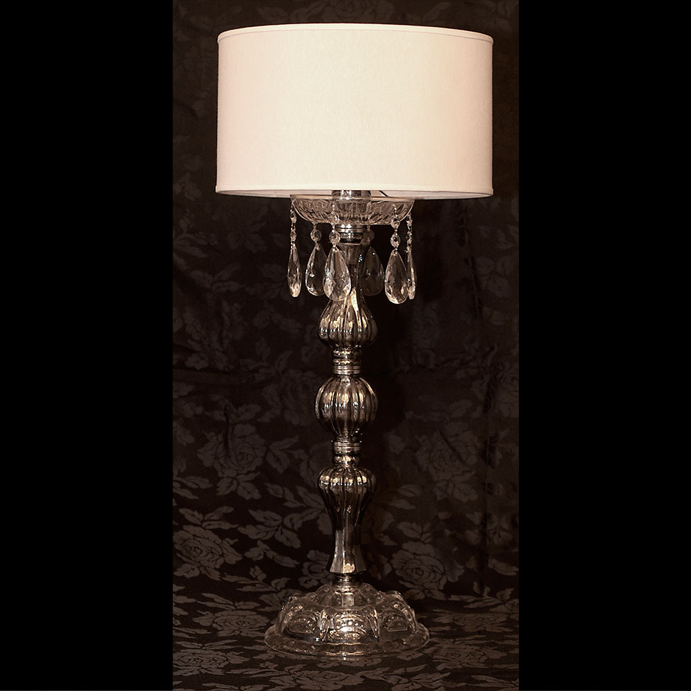Lámpara de Mesa en Vidrio, color laminado en Plata y Cristal con Pantalla en Lino blanco